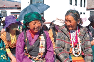 Photo shows villagers smiling after moving into their new houses in Geding Town of Sakya, Shigatse of southwest China's Tibet Autonomous Region. [China Tibet News /Zhang Bin]