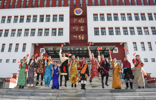 Students perform during an event to celebrate the 70th anniversary of the founding of the People's Republic of China at Tibet University in Lhasa, capital of southwest China's Tibet Autonomous Region, Sept. 12, 2019. (Xinhua/Jigme Dorje)