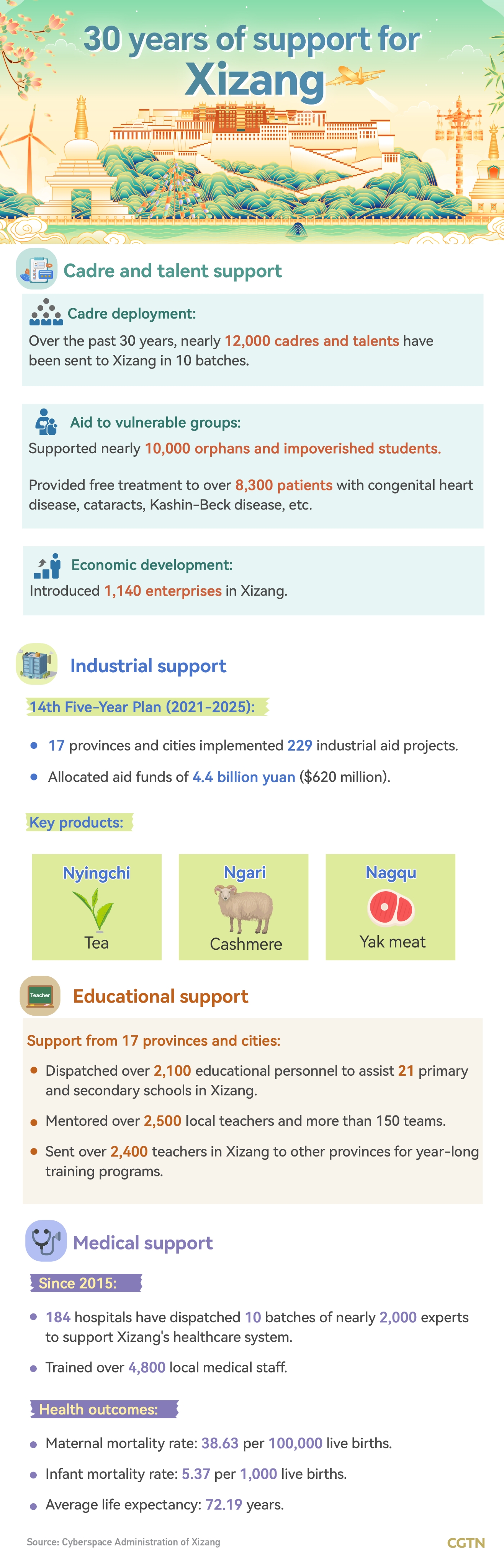 Over the past three decades, 10 batches of nearly 12,000 cadres and talents have been sent to Xizang Autonomous Region from elsewhere in China. From economic development and education to healthcare, the infographic below highlights the key achievements of these efforts.