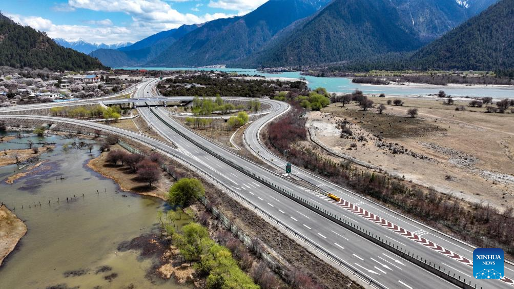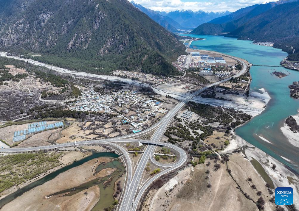 This aerial drone photo taken on April 1, 2025 shows the high-grade highway from Lhasa to Nyingchi in southwest China's Xizang Autonomous Region. From 2012 to 2024, Xizang has completed a total investment of 401.925 billion yuan (about 55.86 billion U.S. dollars) in fixed assets in highway transportation, and the total highway mileage has increased from 65,200 kilometers in 2012 to 124,900 kilometers by the end of 2024.(Xinhua/Jigme Dorje)