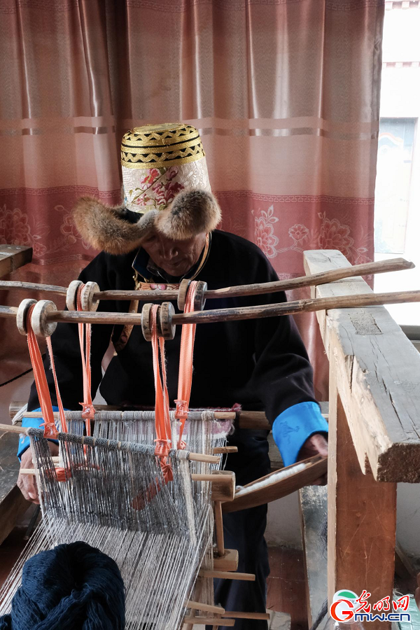 Photo taken on July 27, 2025, shows Ngawang Tendar weaving pulu on a loom. (Zhang Andi/Guangming Online)