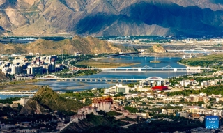 Bridges over the Lhasa River are pictured in Lhasa, southwest China's Xizang Autonomous Region, July 30, 2025. During the 1950s, the first bridge over the Lhasa River was built, ending the reliance on sheepskin rafts for river crossings. Nowadays, multiple bridges span the river across downtown Lhasa, reflecting the region's rapid progress in transportation and urban development. (Xinhua/Jiang Fan)
