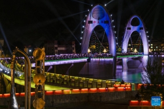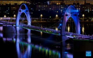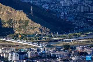 This photo taken on July 30, 2025 shows a bridge over the Lhasa River, in Lhasa, southwest China's Xizang Autonomous Region. During the 1950s, the first bridge over the Lhasa River was built, ending the reliance on sheepskin rafts for river crossings. Nowadays, multiple bridges span the river across downtown Lhasa, reflecting the region's rapid progress in transportation and urban development. (Xinhua/Jiang Fan)