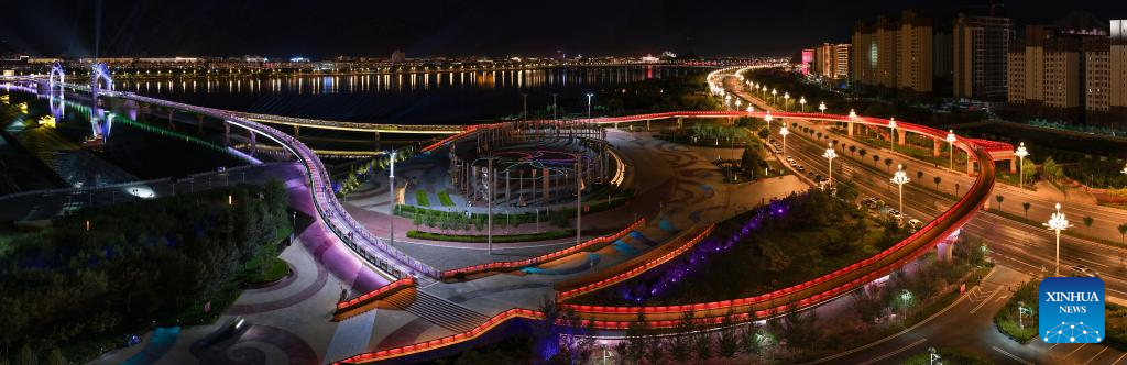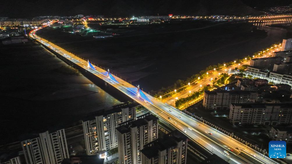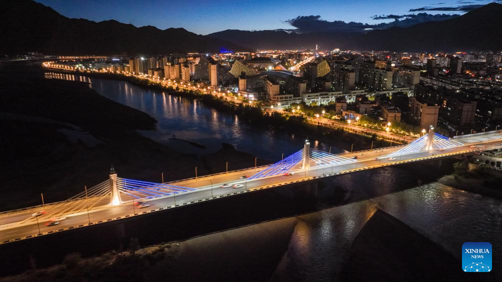 Bridges over the Lhasa River are pictured in Lhasa, southwest China's Xizang Autonomous Region, Aug. 1, 2025. During the 1950s, the first bridge over the Lhasa River was built, ending the reliance on sheepskin rafts for river crossings. Nowadays, multiple bridges span the river across downtown Lhasa, reflecting the region's rapid progress in transportation and urban development. (Xinhua/Jiang Fan)