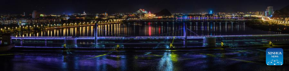 A stitched panoramic aerial drone photo taken on July 30, 2025 shows a bridge over the Lhasa River, in Lhasa, southwest China's Xizang Autonomous Region. During the 1950s, the first bridge over the Lhasa River was built, ending the reliance on sheepskin rafts for river crossings. Nowadays, multiple bridges span the river across downtown Lhasa, reflecting the region's rapid progress in transportation and urban development. (Xinhua/Jiang Fan)