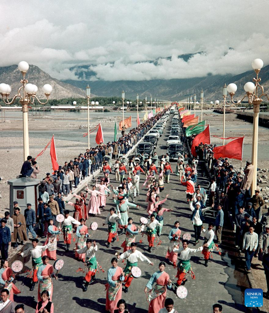 This file photo taken on Aug. 25, 1965 shows the inauguration ceremony of the Lhasa Bridge in Lhasa, southwest China's Xizang Autonomous Region. During the 1950s, the first bridge over the Lhasa River was built, ending the reliance on sheepskin rafts for river crossings. Nowadays, multiple bridges span the river across downtown Lhasa, reflecting the region's rapid progress in transportation and urban development. (Xinhua)