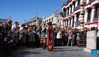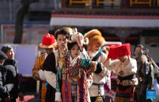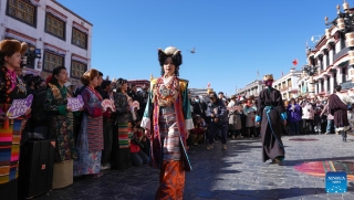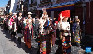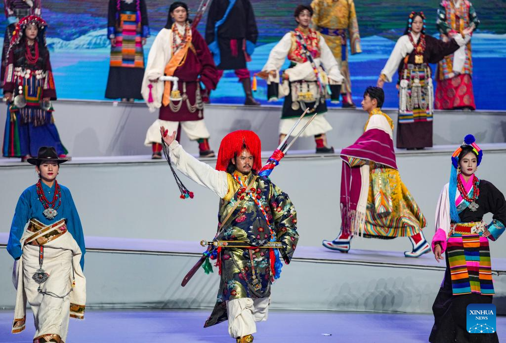 This photo taken on Jan. 3, 2025 shows models presenting traditional Tibetan costumes during a New Year fashion show in Lhasa, southwest China's Xizang Autonomous Region. Traditional Tibetan costumes, after centuries of evolution and development, have formed rich styles and unique features. (Xinhua/Jigme Dorje)