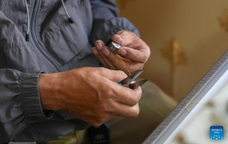 Losang Monlam shows the details in making costumes at a shop of his graduated apprentice in Lhasa, southwest China's Xizang Autonomous Region, Aug. 15, 2025. Traditional Tibetan costumes, after centuries of evolution and development, have formed rich styles and unique features. (Xinhua/Jigme Dorje)