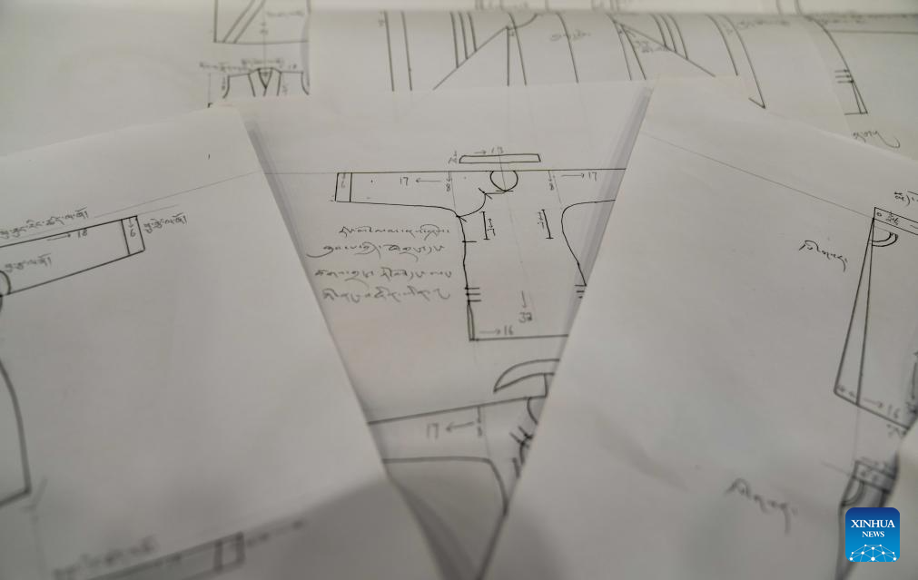 This photo taken on Aug. 15, 2025 shows the gist of making Tibetan costumes drawn by Losang Monlam on paper in Lhasa, southwest China's Xizang Autonomous Region. Traditional Tibetan costumes, after centuries of evolution and development, have formed rich styles and unique features. (Xinhua/Jigme Dorje)