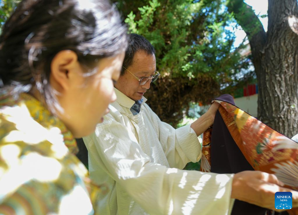 Losang Monlam checks the finished Tibetan costumes at the Sholdo Pal traditional handicrafts school in Lhasa, southwest China's Xizang Autonomous Region, Aug. 15, 2025. Traditional Tibetan costumes, after centuries of evolution and development, have formed rich styles and unique features. (Xinhua/Jigme Dorje)