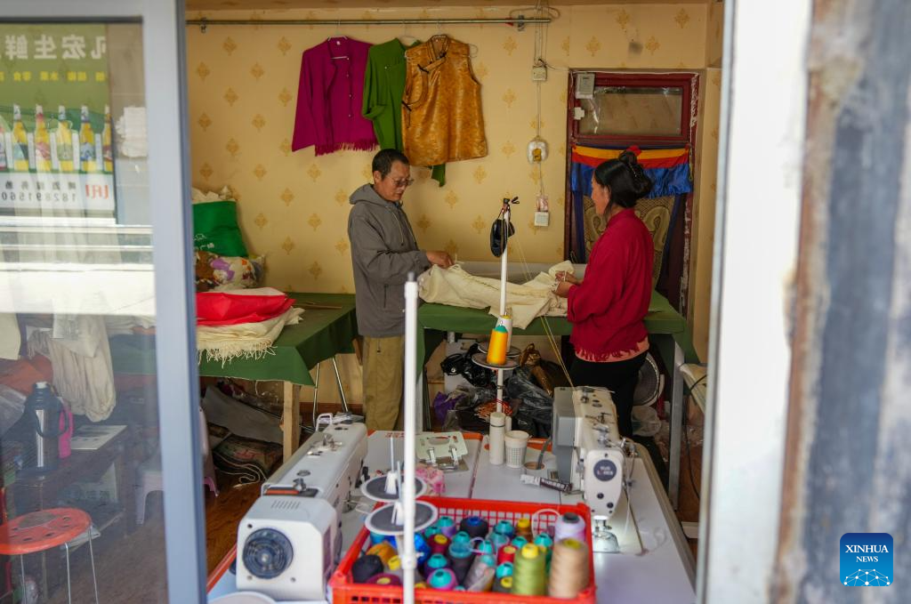 Losang Monlam (R) visits a shop of his graduated apprentice in Lhasa, southwest China's Xizang Autonomous Region, Aug. 15, 2025. Traditional Tibetan costumes, after centuries of evolution and development, have formed rich styles and unique features. (Xinhua/Jigme Dorje)