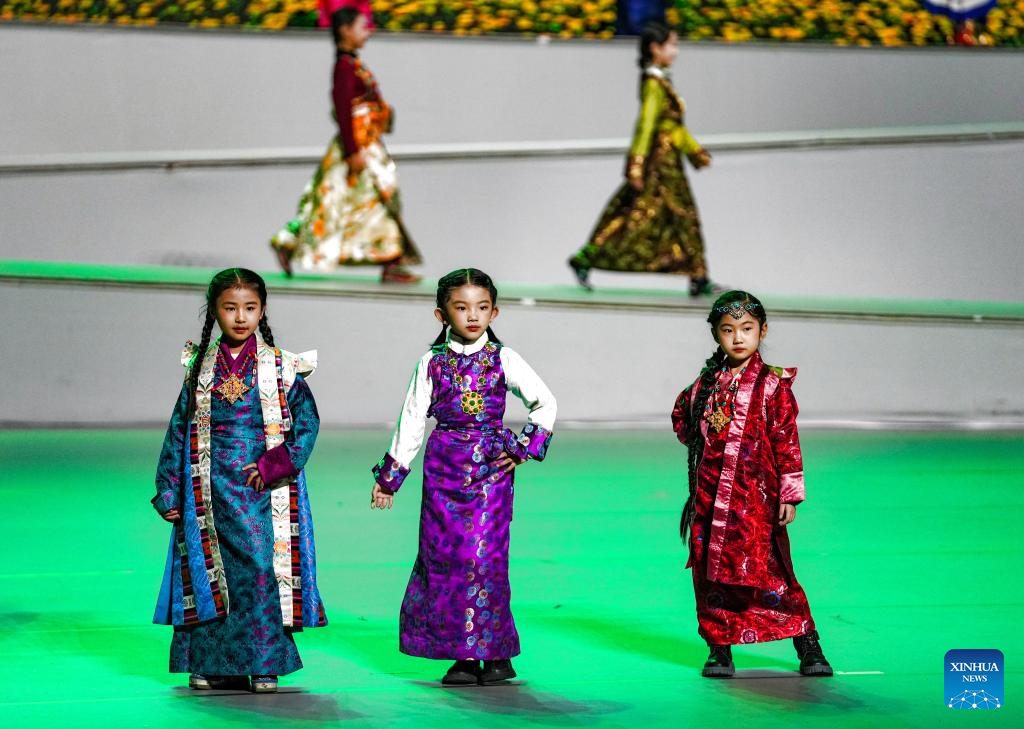 This photo taken on Jan. 5, 2025 shows children presenting costumes during a fashion culture week in Lhasa, southwest China's Xizang Autonomous Region. Traditional Tibetan costumes, after centuries of evolution and development, have formed rich styles and unique features. (Xinhua/Jigme Dorje)