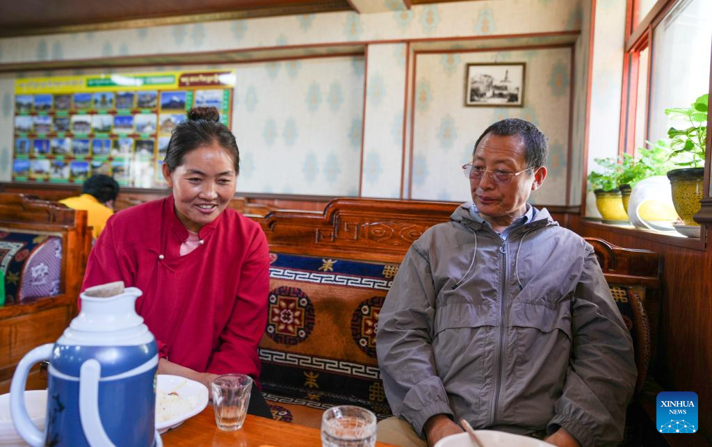 Losang Monlam (R) chats with a graduated apprentice at a teahouse in Lhasa, southwest China's Xizang Autonomous Region, Aug. 15, 2025. Traditional Tibetan costumes, after centuries of evolution and development, have formed rich styles and unique features. (Xinhua/Jigme Dorje)