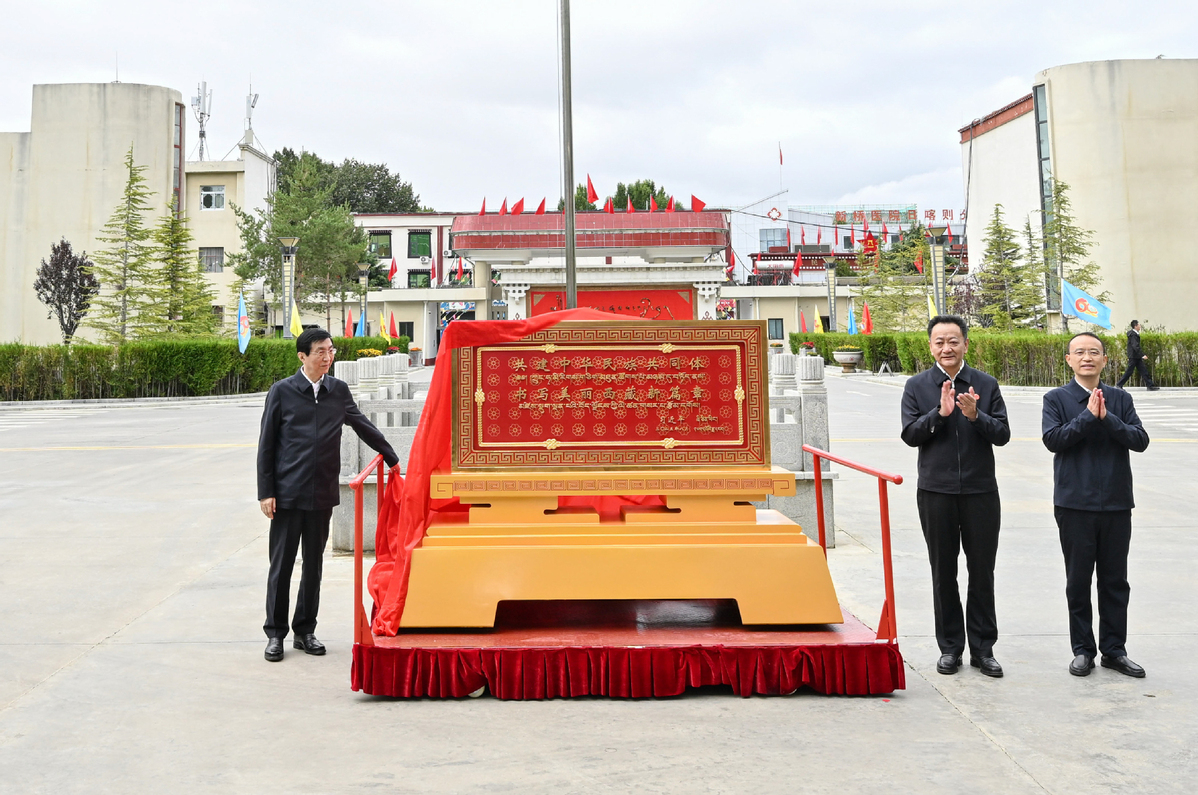 Wang Huning, a member of the Standing Committee of the Political Bureau of the Communist Party of China (CPC) Central Committee, chairman of the National Committee of the Chinese People's Political Consultative Conference and head of a central delegation, and members of the delegation present a plaque to the city of Shigatse, in Southwest China's Xizang autonomous region, Aug 23, 2025. Entrusted by Xi Jinping, general secretary of the CPC Central Committee, members of the central delegation visited local officials and residents in Shigatse on Saturday. [Photo/Xinhua]