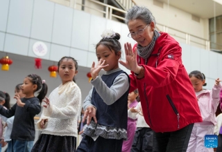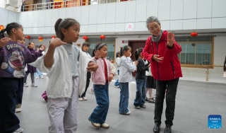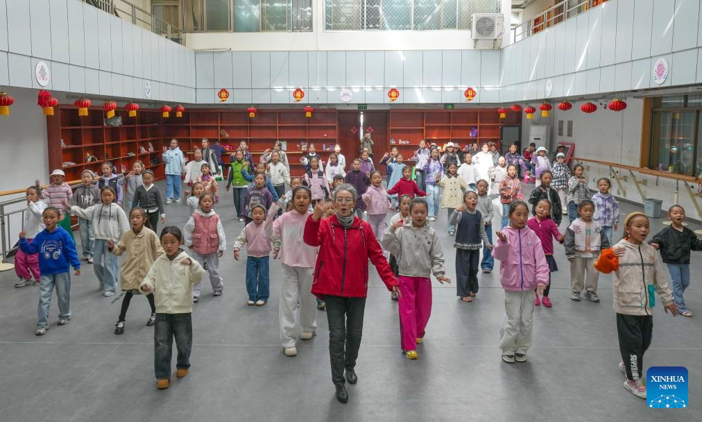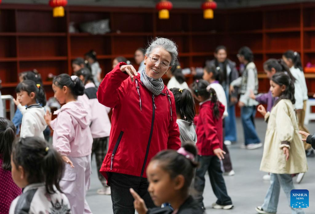 Pasang teaches children Tibetan opera at the public art center in Lhasa, southwest China's Xizang Autonomous Region, Sept. 14, 2025. Pasang, a national first-class performer and retired member of the Tibetan opera troupe of the Xizang Autonomous Region, has voluntarily devoted her weekends to teaching Tibetan opera to children for a decade.(Xinhua/Jigme Dorje)