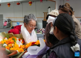 Children present flowers to their teacher Pasang to express their belated Teachers' Day wishes at the public art center in Lhasa, southwest China's Xizang Autonomous Region, Sept. 14, 2025. Pasang, a national first-class performer and retired member of the Tibetan opera troupe of the Xizang Autonomous Region, has voluntarily devoted her weekends to teaching Tibetan opera to children for a decade.(Xinhua/Jigme Dorje)