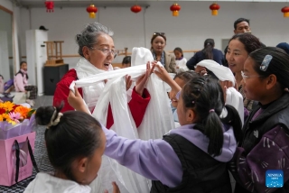 Children present hada to their teacher Pasang to express their belated Teachers' Day wishes at the public art center in Lhasa, southwest China's Xizang Autonomous Region, Sept. 14, 2025. Pasang, a national first-class performer and retired member of the Tibetan opera troupe of the Xizang Autonomous Region, has voluntarily devoted her weekends to teaching Tibetan opera to children for a decade.(Xinhua/Jigme Dorje)