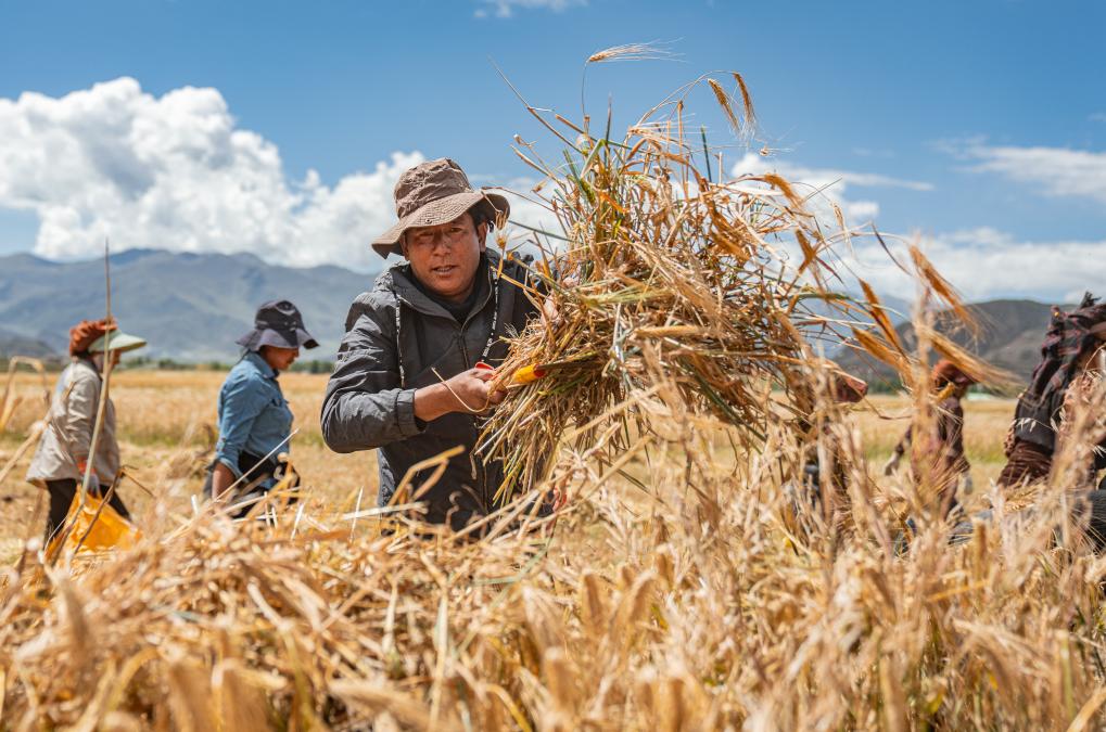 Farmers harvest highland barley in Lhunzhub County, in Lhasa, southwest China's Xizang Autonomous Region, Sept. 23, 2025. (Xinhua/Tenzin Nyida)