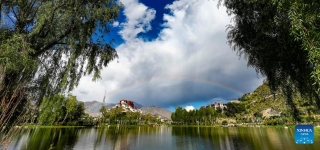 This photo taken on Sept. 21, 2025 shows a view of the Potala Palace in the distance under a rainbow in Lhasa, southwest China's Xizang Autonomous Region. (Xinhua/Jigme Dorje)