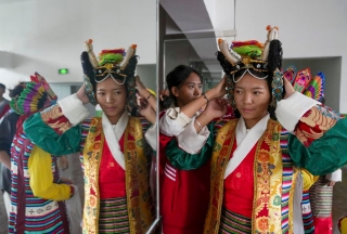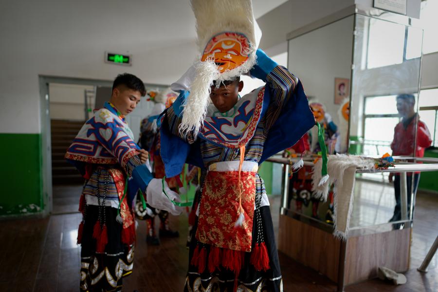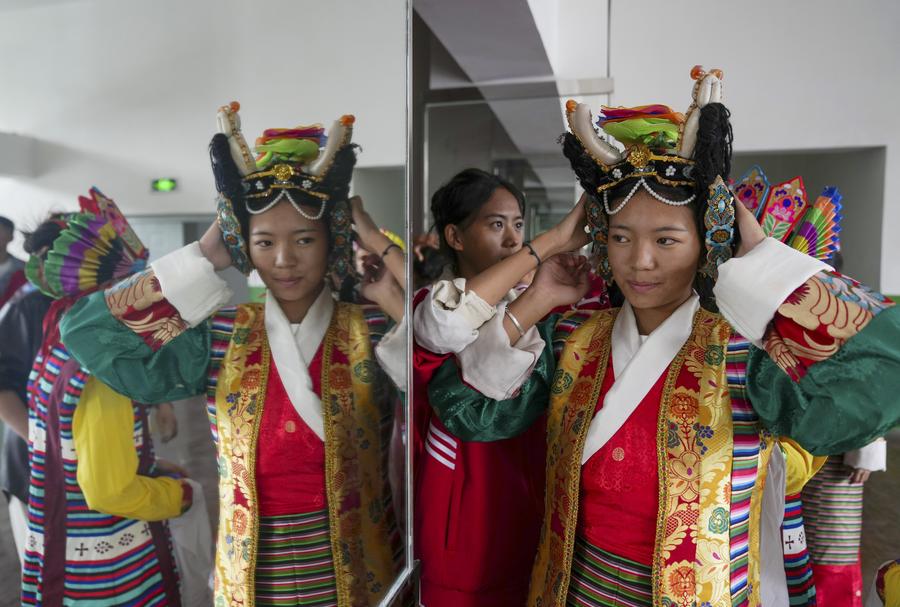 Students put on Tibetan opera costumes at Lhasa No. 2 secondary vocational and technical school in Lhasa, southwest China's Xizang Autonomous Region, Sept. 9, 2025. (Xinhua/Zhang Xiaoyu)