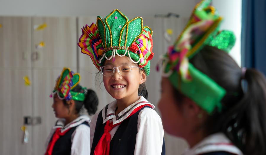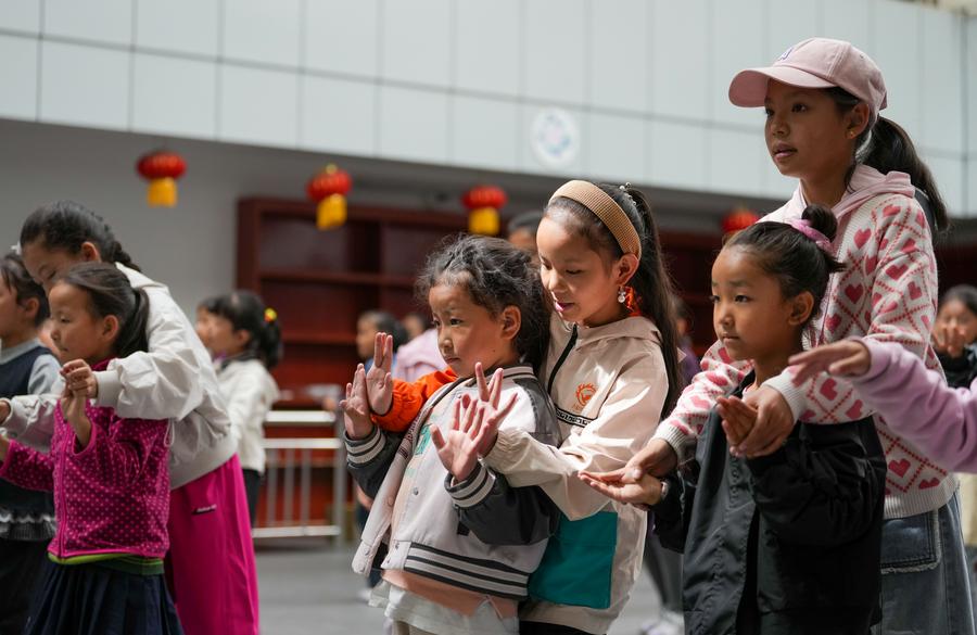 Students practice Tibetan opera at Lhasa Experimental Primary School in Lhasa, southwest China's Xizang Autonomous Region, Sept. 11, 2025. (Xinhua/Jigme Dorje)