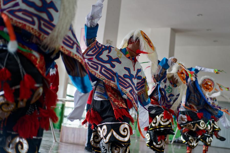 Students review moves of Tibetan opera at Lhasa No. 2 secondary vocational and technical school in Lhasa, southwest China's Xizang Autonomous Region, Sept. 9, 2025. (Xinhua/Tenzin Nyida)