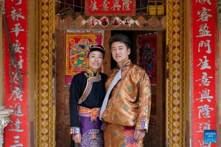 Nenkasman poses for a photo with her husband in front of their home in Qiaoqi Tibetan Township of Baoxing County, Ya'an City, southwest China's Sichuan Province, Oct. 8, 2025. Nenkasman, 40, hailing from Qiaoqi Tibetan Township in Baoxing County, Ya'an City, has been leading a diverse life. (Xinhua/Xu Bingjie)