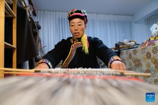 Nenkasman (L) teaches weaving techniques at a villager's home in Qiaoqi Tibetan Township of Baoxing County, Ya'an City, southwest China's Sichuan Province, April 1, 2025. (Photo by Zhu Tao/Xinhua)