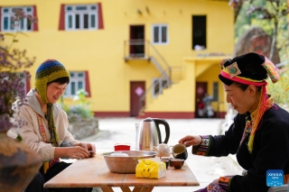 Nenkasman (R) drinks tea with a tourist at her guesthouse in Qiaoqi Tibetan Township of Baoxing County, Ya'an City, southwest China's Sichuan Province, Oct. 8, 2025. (Xinhua/Xu Bingjie)