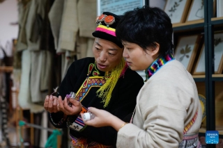 Nenkasman (L) instructs a tourist to experience the techniques of yak wool spinning at her studio in Qiaoqi Tibetan Township of Baoxing County, Ya'an City, southwest China's Sichuan Province, Oct. 7, 2025. (Xinhua/Xu Bingjie)