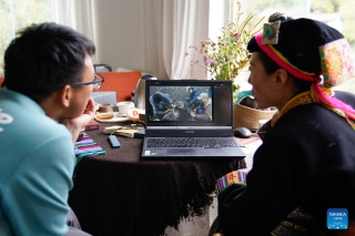 Nenkasman (R) displays the video she recorded to Lu Juntang, a graduate student who is conducting a research here in Qiaoqi Tibetan Township of Baoxing County, Ya'an City, southwest China's Sichuan Province, Oct. 8, 2025. (Xinhua/Xu Bingjie)