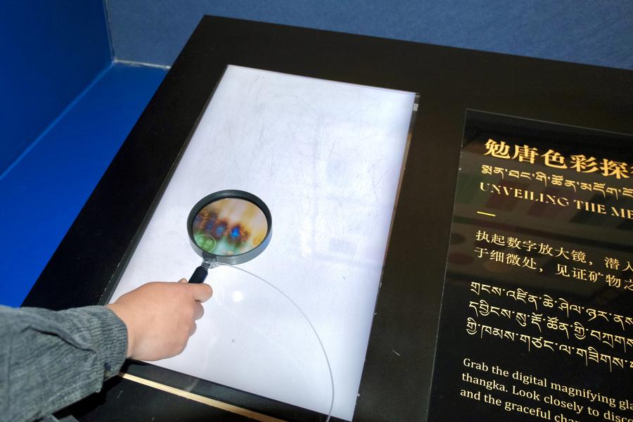 This photo taken on Oct. 21, 2025 shows an interactive device at a thangka art exhibition in the Xizang Museum in Lhasa, southwest China's Xizang Autonomous Region. (Xinhua/Zhou Yulong)