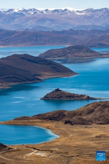 An aerial drone photo taken on Nov. 20, 2025 shows the scenery of the Yamzbog Yumco Lake in southwest China's Xizang Autonomous Region. (Xinhua/Jiang Fan)