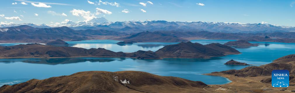 A stitched aerial drone photo taken on Nov. 20, 2025 shows the scenery of the Yamzbog Yumco Lake in southwest China's Xizang Autonomous Region. (Xinhua/Jiang Fan)
