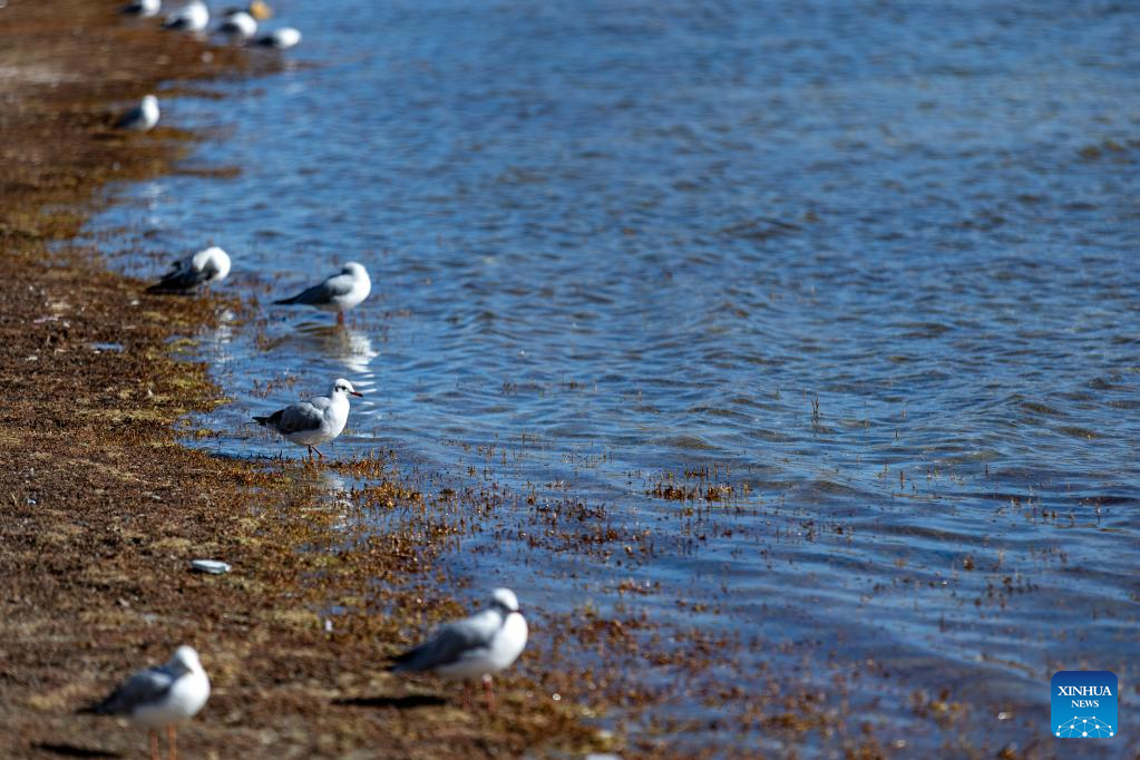 Red-billed gulls are pictured on the shore of the Yamzbog Yumco Lake in southwest China's Xizang Autonomous Region, on Nov. 20, 2025. (Xinhua/Li Jian)