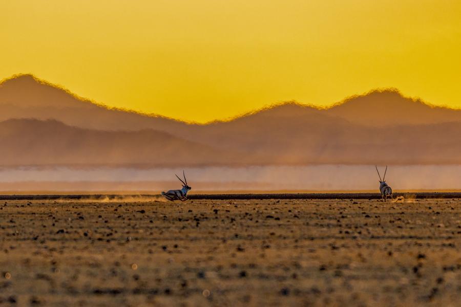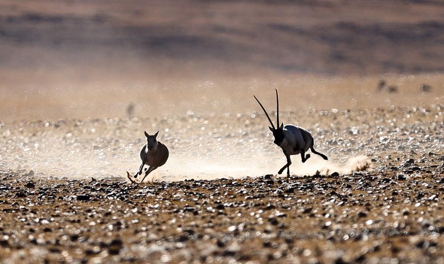 A male Tibetan antelope (R) chases a female one at the Altun Mountains National Nature Reserve in northwest China's Xinjiang Uygur Autonomous Region, Dec. 5, 2025. (Xinhua/Xin Yuewei)