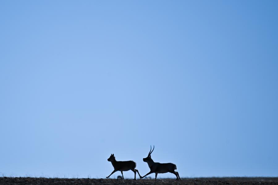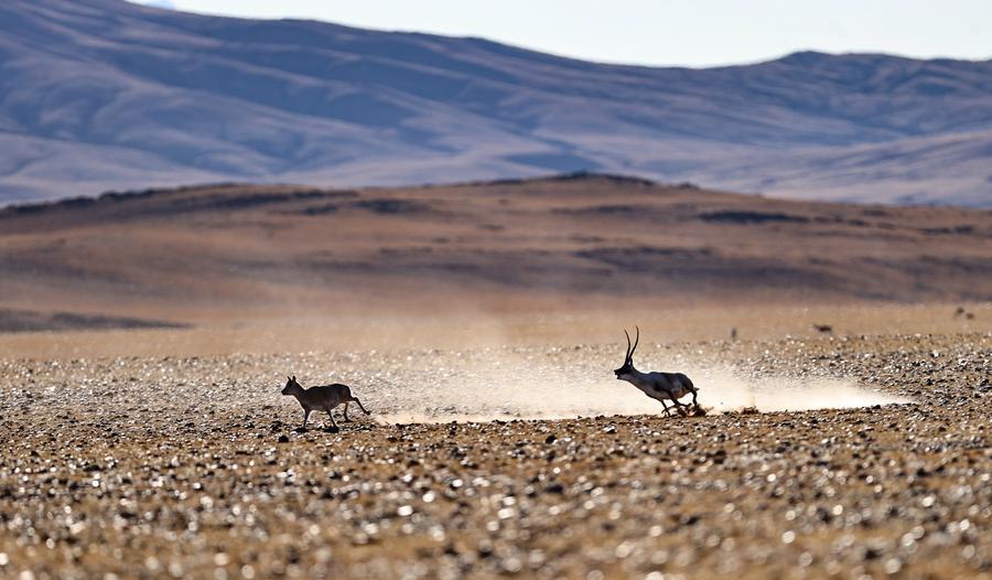A male Tibetan antelope chases a female one at the Changtang National Nature Reserve in southwest China's Xizang Autonomous Region, Dec. 1, 2025. (Xinhua/Guo Yu)