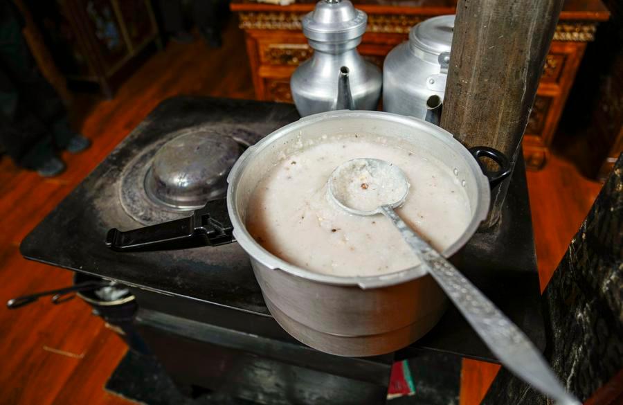 Two days ahead of the Tibetan New Year is the traditional "Gutu Eve" for families to have a feast of "gutu," a traditional soup dish made of flour, at home. "Gu" in Tibetan means nine, which is a lucky number. "Tu" means "pasta." Nine different fillings like wool, charcoal and chili are placed inside the dough drops, and each of these fillings has a meaning. While in Burang, "Gutu" is a sort of porridge with nine ingredients and also a distinctive dish on the dinner table of the "Gutu Eve."