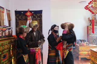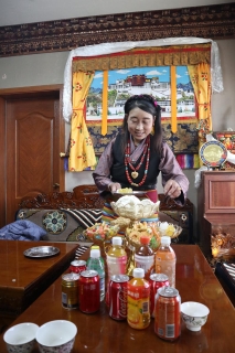 January marks both the anniversary of post-disaster reconstruction and Losar New Year, making the period especially significant for villagers. Homes are decorated with traditional Chemar boxes, barley ears known as Losar Metok, and symbolic New Year items such as barley wine, ginseng fruit, and sheep's head. Modern household appliances sit alongside traditional decorations, reflecting daily life after resettlement.