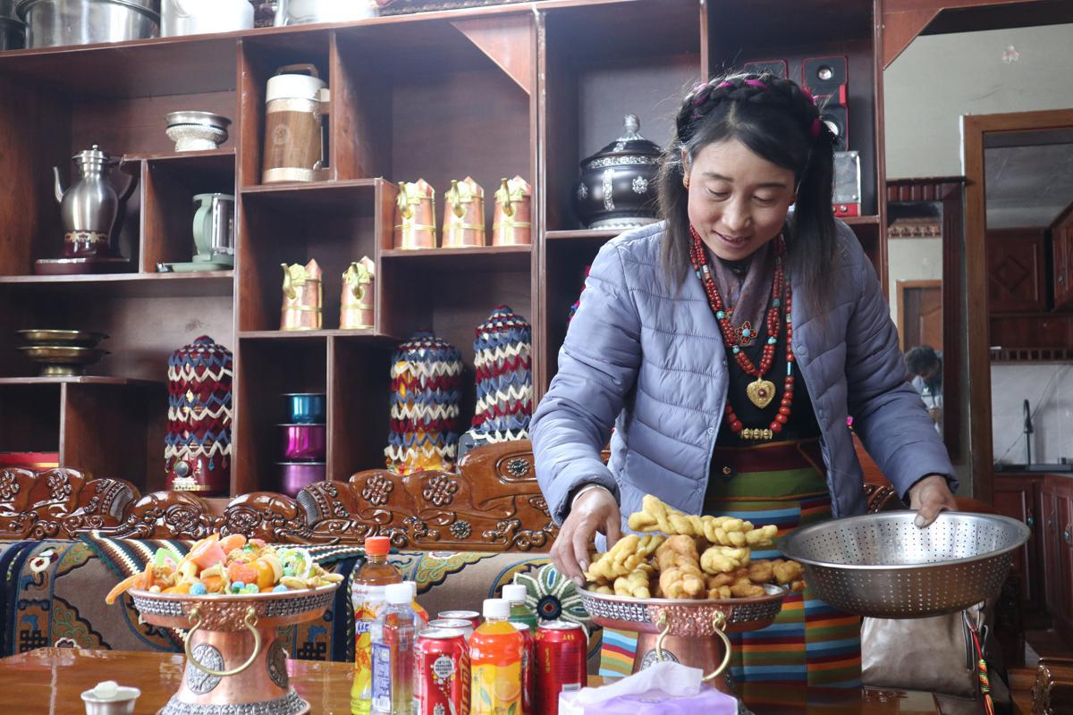 Golden fried dough sticks, a traditional New Year food symbolizing harvest and good fortune, are being prepared as villagers make ready for the holiday. Pema Chungdak, a resident of the village, said that the golden color embodies harvest and wishes for a happy life and hopes for the new year.