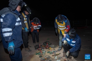 Workers count their tools after completing their work in Amdo County, Nagqu, southwest China's Xizang Autonomous Region, Jan. 23, 2026. (Xinhua/Tenzing Nima Qadhup)
