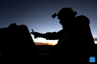 Workers head to Za'gya Zangbo Station to inspect signal equipment during strong winds in Amdo County, Nagqu, southwest China's Xizang Autonomous Region, Jan. 24, 2026. (Xinhua/Tenzing Nima Qadhup)