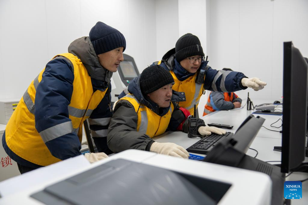 Workers review monitoring data at Za'gya Zangbo signal maintenance section in Amdo County, Nagqu, southwest China's Xizang Autonomous Region, Jan. 24, 2026. (Xinhua/Tenzing Nima Qadhup)