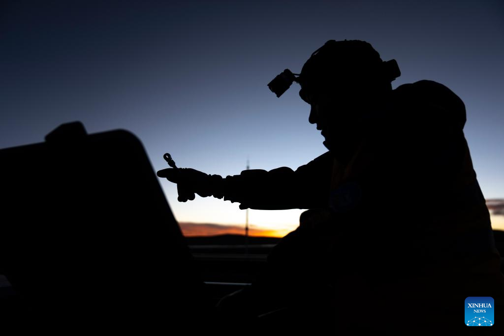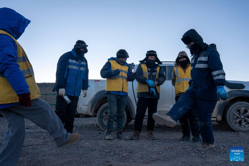Workers dance Guozhuang, a traditional Tibetan square dance, while waiting for maintenance window operations in Amdo County, Nagqu, southwest China's Xizang Autonomous Region, Jan. 23, 2026. (Xinhua/Tenzing Nima Qadhup)