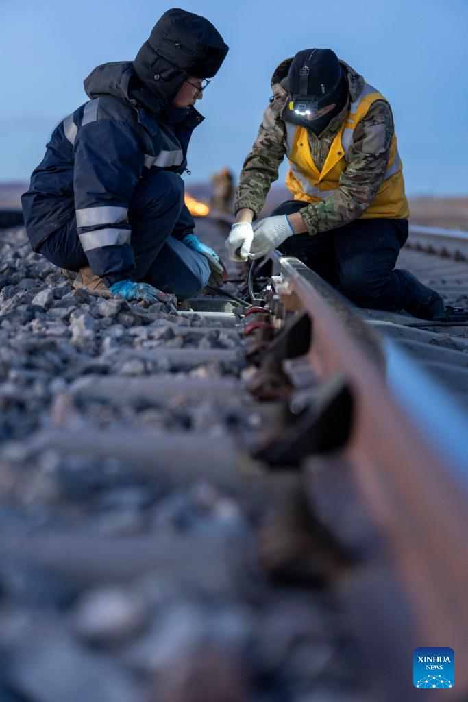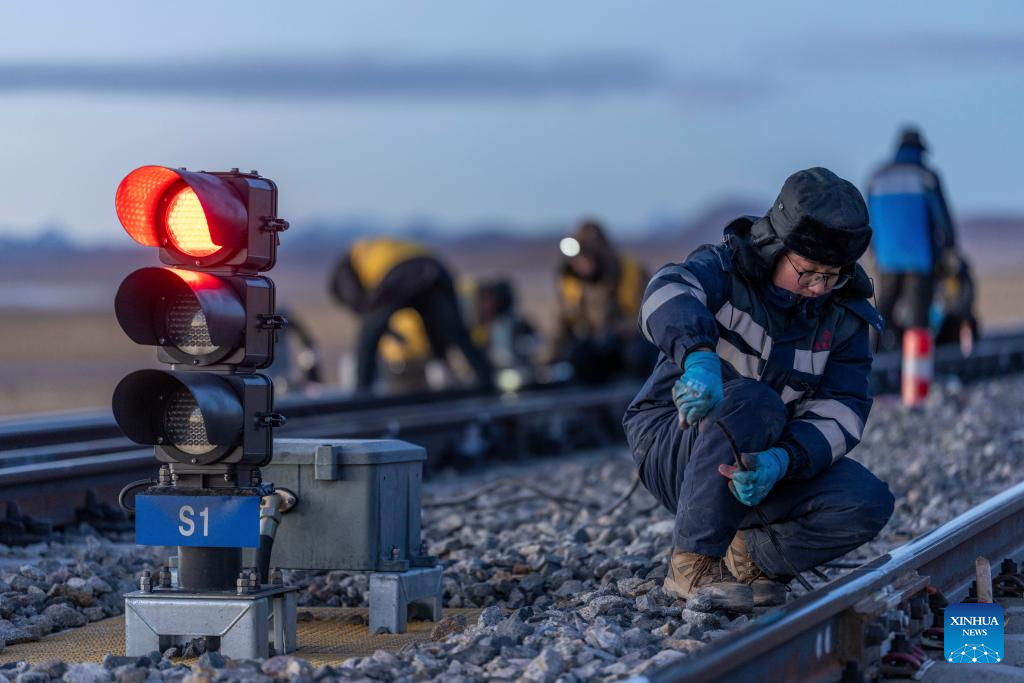A worker checks gaps on a switch machine in Amdo County, Nagqu, southwest China's Xizang Autonomous Region, Jan. 23, 2026. (Xinhua/Tenzing Nima Qadhup)
