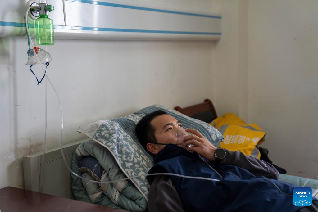 A worker takes oxygen at the dormitory after returning to the Za'gya Zangbo signal maintenance section in Amdo County, Nagqu, southwest China's Xizang Autonomous Region, Jan. 24, 2026. (Xinhua/Tenzing Nima Qadhup)