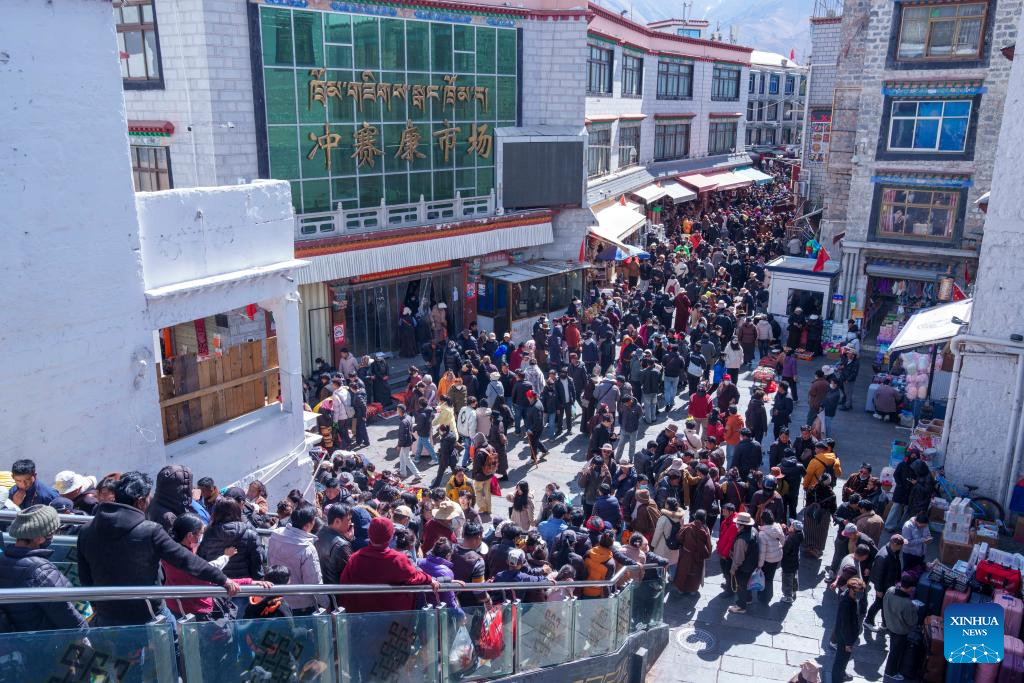 People shop near Barkhor Street in Lhasa, southwest China's Xizang Autonomous Region, Feb. 15, 2026. (Xinhua/Tenzin Nyida)