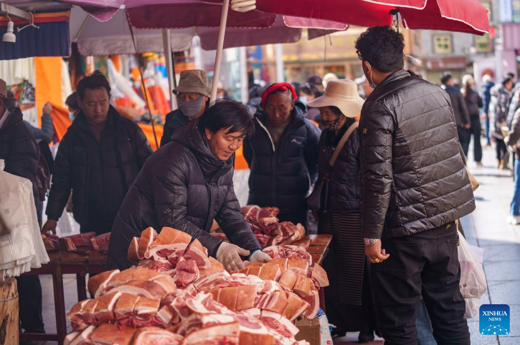 With the Spring Festival and the Tibetan New Year right around the corner, market places in Lhasa receive a surge of customers buying goods needed for the holidays.