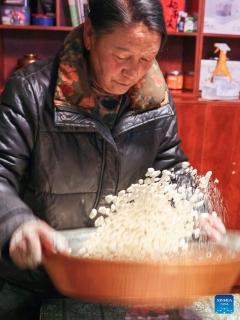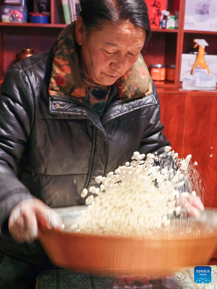 Chocho's wife Tasang prepares ingredients of "gutu" at home in Lhasa, southwest China's Xizang Autonomous Region, Feb. 16, 2026. (Xinhua/Zhang Licong)