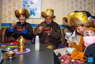 Chocho's family members enjoy "gutu" at their home in Lhasa, southwest China's Xizang Autonomous Region, Feb. 16, 2026. (Xinhua/Tenzin Nyida)